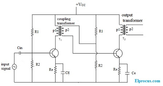 What is Transformer Coupled Amplifier and Its Working The major characteristics of the signal are voltage and frequency. If the signal has a sufficient range of voltage, then we can transmit information up to a distance and it is used for communication purposes. Here the interesting concept is “amplifier”. An amplifier amplifies the voltage or increases the voltage value. The designing of amplifiers can be done in several ways. Few of them are transistors based amplifiers; resistor & capacitors based amplifiers, transformer-based amplifiers, etc. To drive more output then multistage amplifiers are introduced. In these multistage-amplifiers, the cascading of amplifiers can be done through capacitors, transformers, inductors, etc. The issues with RC coupled amplifiers are it has the low voltage gain, power gain, low input impedance, and high output impedance. Due to these drawbacks, the transformer-coupled amplifier is used. Coupling the transformers in cascading way at one stage, the input impedance will be high and output impedance will below. By the end of this article, we can understand the terms like what is a transformer-coupled amplifier, its circuit diagram, working, applications, advantages & disadvantages. What is Transformer Coupled Amplifier? This amplifier comes under the category of the multi-stage amplifier. In this type of amplifier one stage of the amplifier is connected to the second stage of amplifiers by coupling the “transformer”. Because we can achieve impedance equality through the transformers. The impedances of the two stages can be equaled if any stage has low or high impedance value by transformers. So, the voltage gain and power gain also increases. These amplifiers are preferable when the load is small and used for power amplification purposes. “The reason behind preferring the transformers in amplifiers is, they provide equal impedance (impedance matching with load can be possible) through primary, secondary windings of the two transformers which are using in the amplifier”. P1, P2, and B1, B2 are the primary and secondary windings of the transformers. The primary coil and secondary coil impedance are related to B2 = B1*(P2/P1)^2. According to this formula, the two transformers coil impedances are related to each other. Transformer Coupled Amplifier Circuit Diagram The above diagram shows the circuit diagram of the transformer-coupled amplifier. In the circuit diagram, one stage output is connected as an input to the second stage amplifier through a coupling transformer. In the RC coupling amplifier, cascading of the first & second stage amplifier can be done through a coupling capacitor. The coupling transformer is T1 & it’s primary and secondary windings are P1 and P2. Similarly, secondary transformer T2 having the primary windings p1 and secondary windings are indicated by p2. transformer-coupled amplifier R1 & R2 resistors provide the biasing and stabilization for the circuit. Cin isolates DC and allows only AC components from the input signal to the circuit. The emitter capacitor provides a low reactance path to the signal and offers stability to the circuit. The first stage of output is connected as an input to the second stage through secondary windings (p2) of the primary transformer. Transformer Coupled Amplifier Working The working and operation of the transformer-coupled amplifier will be discussed in this segment. Here, the input signal is applied to the base of the first transistor. If the input signal has any DC signal then the components can be eliminated by the input capacitor Cin. When the signal is applied to the transistor then it amplifies & forwards to the collector terminal. Here this amplified output connected as an input to the second stage of the transformer-coupled amplifier through secondary windings (p2) of the coupling transformer. Then, this amplified voltage is applied to the base terminal of the second transistor of the secondary stage of the transformer-coupled amplifier. The transformer has the property of impedance matching. By this property, low resistance of one stage can be reflected as high load resistance to the previous stage. Therefore the voltage at primary windings can be forwarded according to the ratio of secondary windings of the transformer. Frequency Response of Transformer Coupled Amplifier The frequency response of an amplifier allows us to analyze the output gain and phase response for a particular frequency or over a wide range of frequencies. The frequency response of any electronic circuit indicates the gain i.e., how much of output we are getting for an input signal. Here, the frequency response of the transformer-coupled amplifier is shown in the following figure. frequency response-of-transformer-coupled-amplifier It offers low-frequency response characteristics than the RC coupled amplifier. And also transformer-coupled amplifier offers constant gain over a small range of frequencies. At low frequencies, due to the reactance of the primary transformer p1, the gain is decreased. At higher frequencies, the capacitance between the turns of the transformer will act as a condenser and this reduces the output voltage and this leads to decrement in gain. Transformer Coupled Amplifier Applications Mostly applicable in systems where to match the impedance levels. Applicable in circuits for transferring the maximum power to the output devices like speakers. For power amplification purposes these transfer coupled amplifiers are preferable Advantages The advantages of a transformer-coupled amplifier are It Provides a higher gain than the RC coupled amplifier. It offers 10 to 20 times higher gain value than the RC coupled amplifier. The biggest advantage is it has the feature of impedance matching that can be done by the turn’s ratio of the transformer. So, one stage lower impedance can be adjusted with a high impedance of the next stage amplifier. The collector resistor and base resistor don’t ha